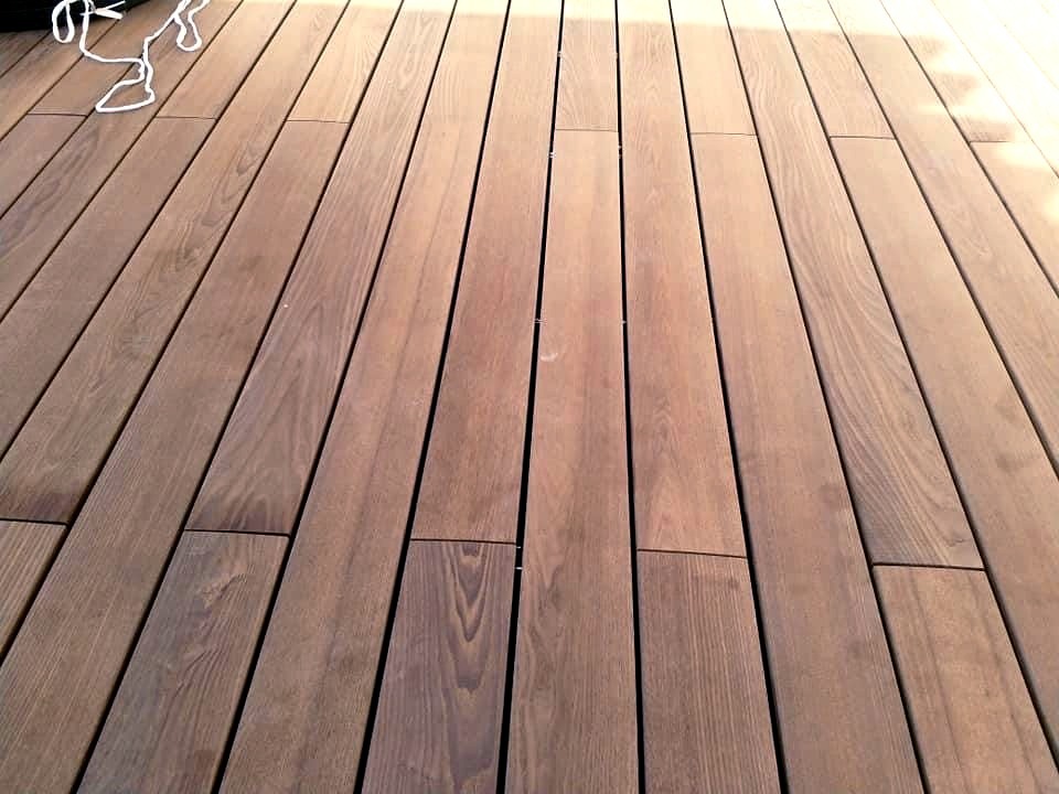 DECKiBOIS présente les lames de terrasse en bois Frêne Thermo Chauffé ou Thermofrêne avec le concept Grad après 1 an d’exposition aux UV et sans entretien