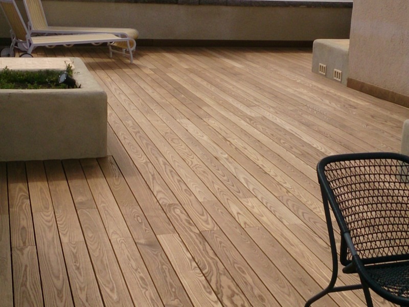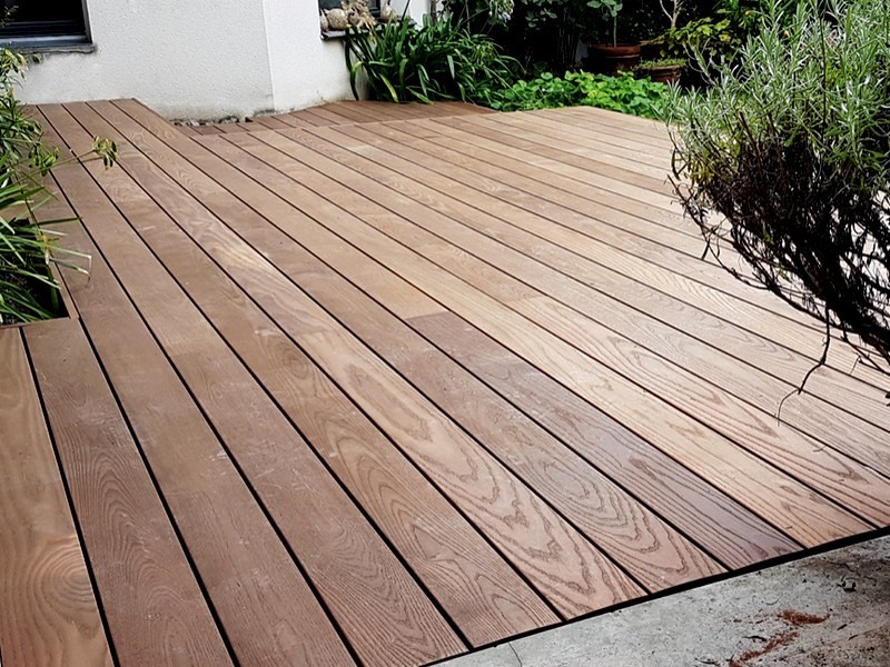 Le Frêne, une fois soumis à un traitement thermique, il est fréquemment utilisé pour la création de lames de terrasse, de bardages en clin ou de claire-voie.