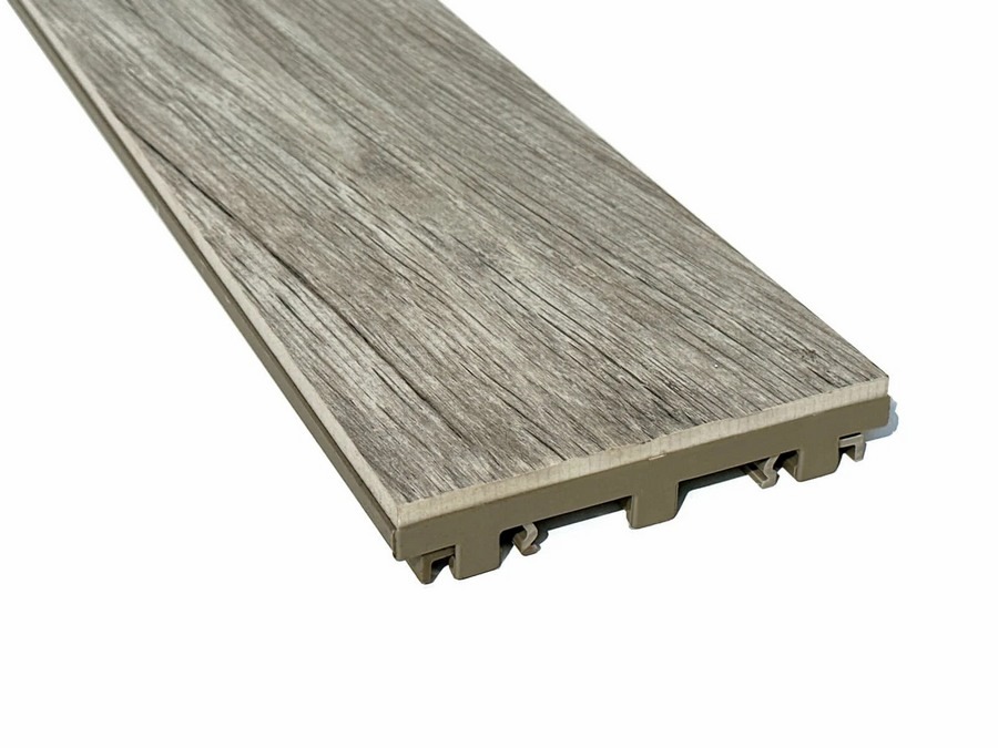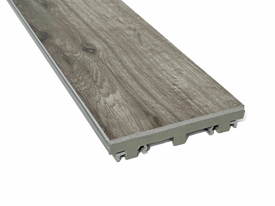 Lame de terrasse en grès cérame lisse fixée sur un support en PVC extrudé avec une armature métallique. La lame a une épaisseur de 28 mm et une largeur de 155 mm