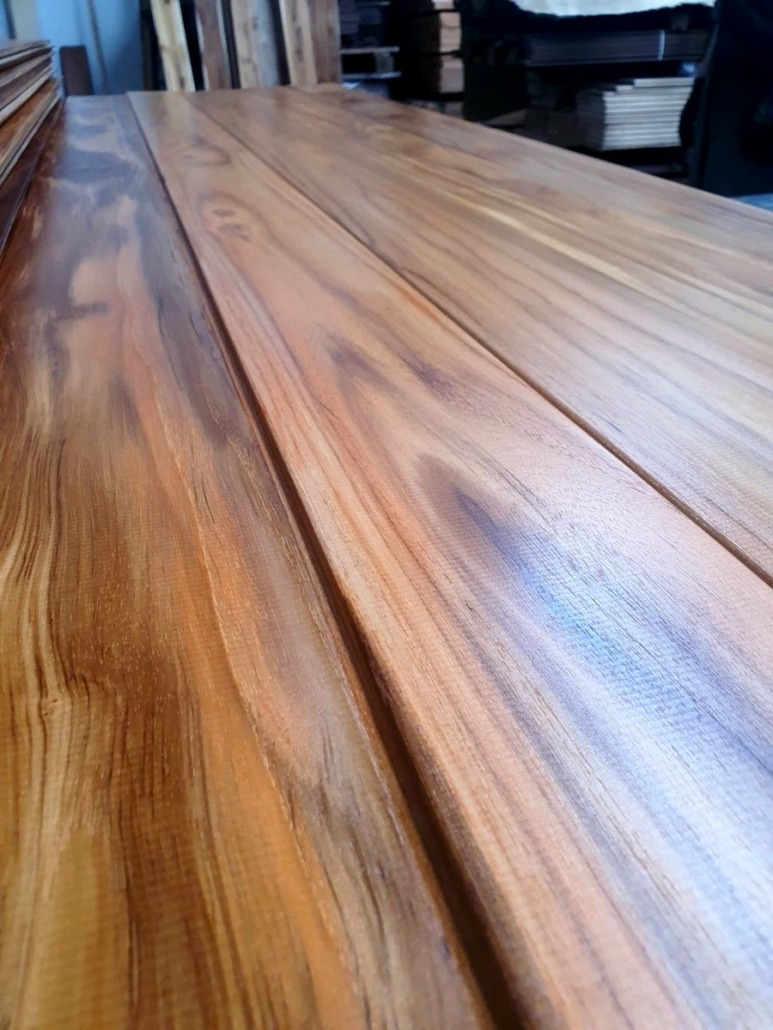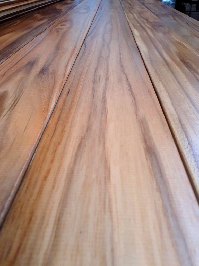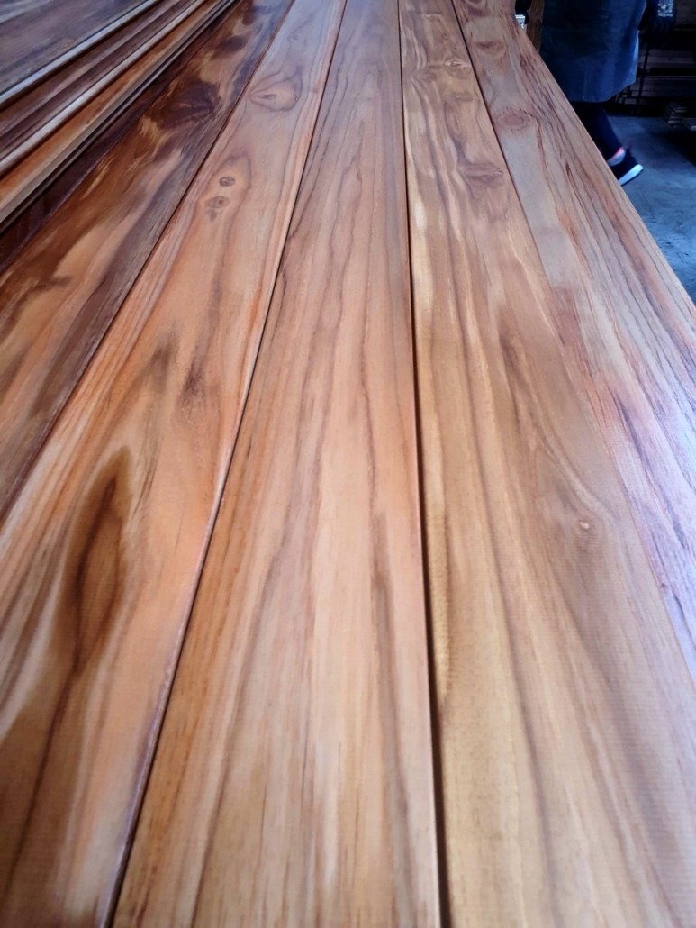 Découvrez les lames de terrasse en Teck, un bois exotique reconnu pour sa stabilité et sa longévité, parfait pour embellir votre extérieur, que ce soit une terrasse, un contour de piscine.